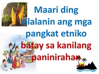 Ang pangkat etniko ay grupo ng mga tao na may mga pagkakatulad o pagkakahawig sa kultura lengguwahe tradisyon at paniniwala.